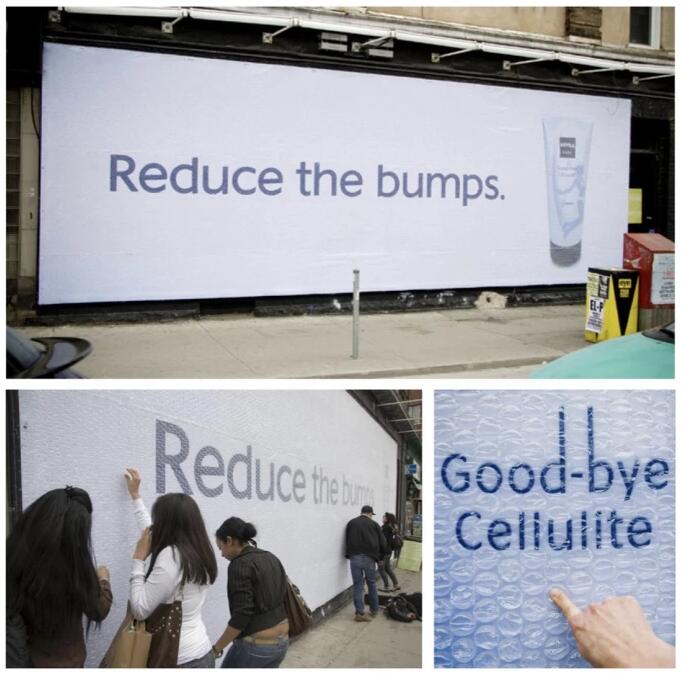 Nivea妮維雅祛痘產(chǎn)品路牌廣告——大家一起來祛痘痘。聽名字就很具備互動廣告的參與性。廣告牌設(shè)置在人流量大的行人道旁,并且在大面積的廣告展位上布滿包裝中常用的多泡沫塑料薄膜材料。這種材料多用于包裝中,起到在運輸過程防震的作用,特點是具有良好的彈性、質(zhì)地柔軟、手感舒適、無污染,可以供路過的人“擠痘痘”。